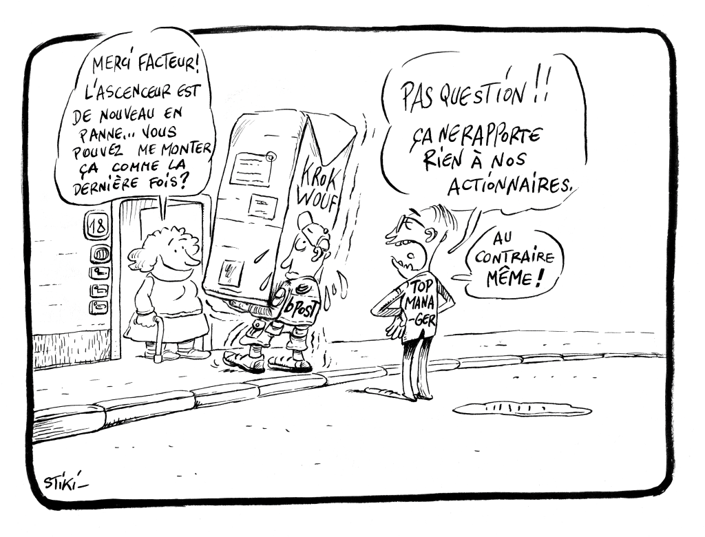 Pour délivrer un recommandé, nous disposons d’une minute trente ! Interdit d’attendre une seconde de plus après avoir sonné à la porte, au-delà on repart et la personne doit aller au bureau de poste le plus proche, c’est à dire souvent de plus en plus loin. Bien entendu, dans cette planification, personne n’a pensé à la dame qui a du mal à s’extirper de son fauteuil, doit parcourir tout le couloir avec une tribune, pour ensuite seulement ouvrir la porte… Nous y revenons donc, dans toutes les dimensions : une organisation au détriment de l’humain.