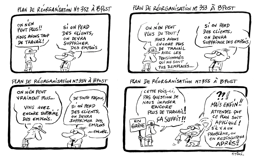 Hallucinant, oui. Et même s’ils sont fautifs dans leur travail, ils partiront avec des parachutes dorés. L’écart entre le salaire du boss et le nôtre est dingue, et évidemment, le bas de l’échelle, c’est nous. Et en cas de problèmes pour la poste, qui va se faire taper sur les doigts ? C’est nous. Ces gens n’ont plus rien à voir avec la poste, ni avec le métier de facteur. Ils gèrent une entreprise de fast-food, ensuite une chaîne de magasins, puis ils débarquent à la poste. En voyant les salaires des managers, les travailleurs sont dégoûtés, c’est clair. Comme pour les revenus des actionnaires, nous sommes dégoûtés. Avant, notre travail servait la collectivité, aujourd’hui nous travaillons pour être « performants ». Et performants, ça signifie engranger des bénéfices pour des actionnaires et pour les salaires des managers, point.